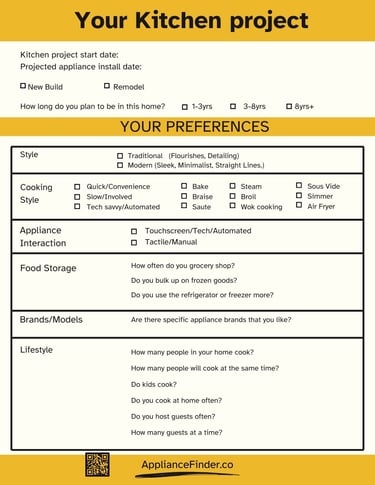Free resource for customers to define the scope and timeline of their kitchen project and self-assess their kitchen appliance portfolio preferences and needs.